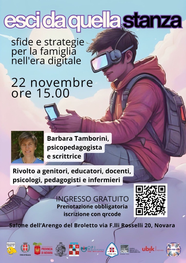 Sabato 22 Novembre presso il Salone dell'Arengo del Broletto - Via F.lli Rosselli 20, Novara, avrà luogo l'incontro intitolato "Esci da quella stanza". La psicoterapeuta e scrittrice Barbara Tamborini si rivolgerà a genitori, docenti, educatori, pedagogisti e infermieri, affrontando le sfide e le strategie delle famiglie nell'era digitale.